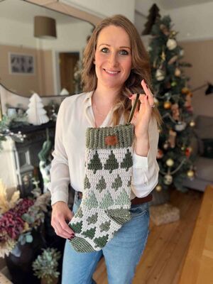 A one piece crochet stocking with striking mosaic trees, dense texture, and even tension, designed for confident results with the support of video tutorials.