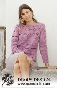 This free crochet pattern uses dk-weight yarn. Pattern attributes and techniques include: Lace pattern, Round Neckline, Round Yoke, Seamless, Top-Down, Trumpet-shaped Sleeve.