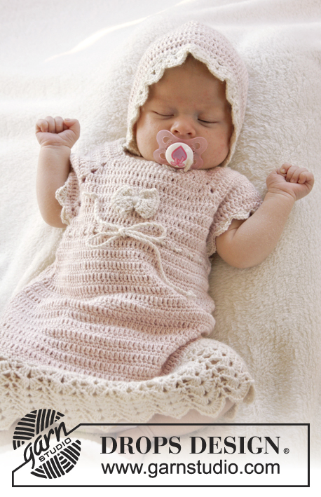 Crochet DROPS dress with raglan, short sleeves and fan edges, worked top down. Size 0-4 years