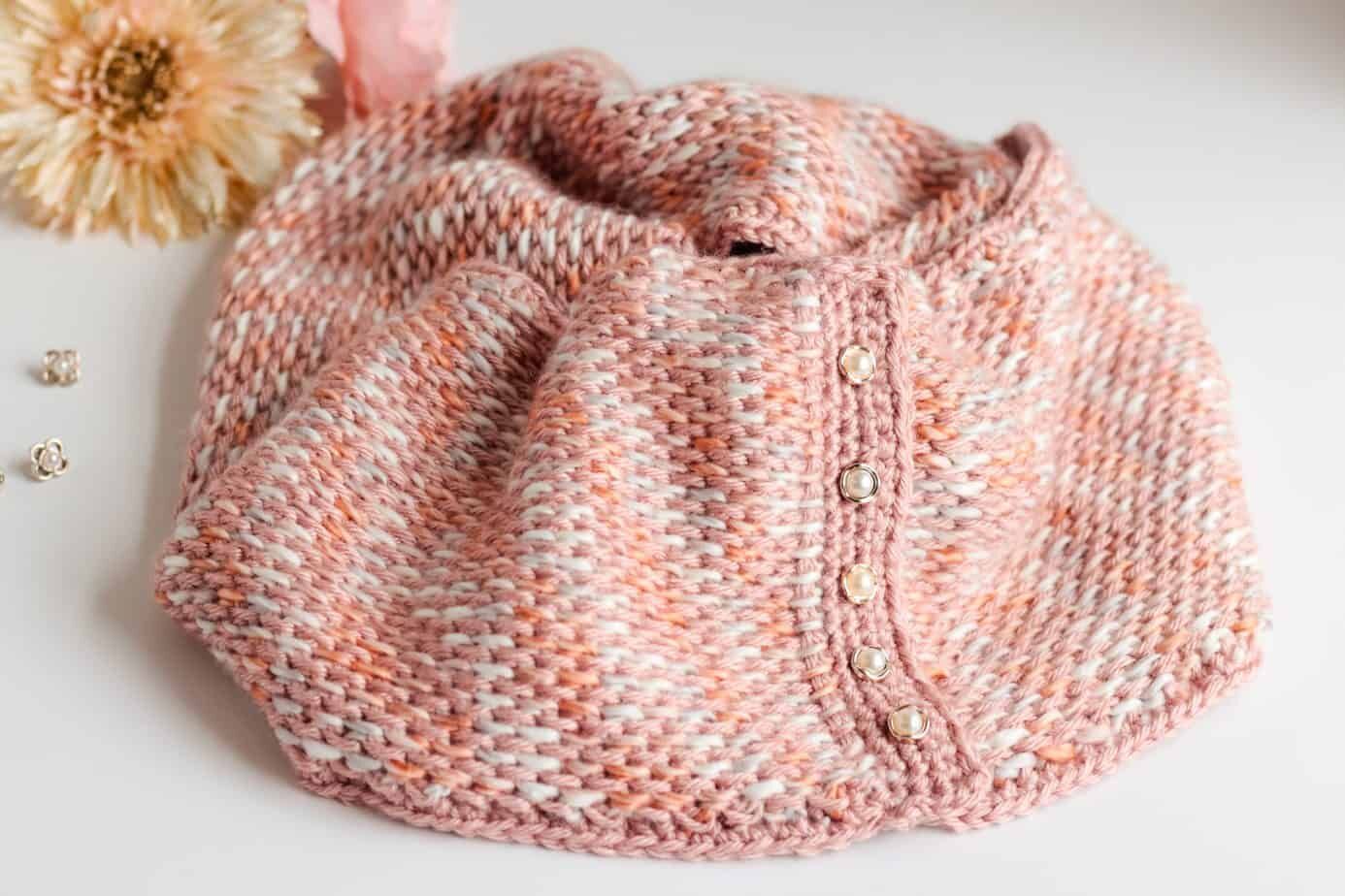 A free crochet pattern using worsted-weight yarn. Pattern attributes and techniques include: Buttons, Colorwork, Infinity, Seamed, Tunisian, Video tutorials, Worked as One Piece.