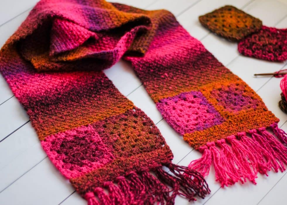 A free crochet pattern using worsted-weight yarn. Pattern attributes and techniques include: Fringe, Granny Square.