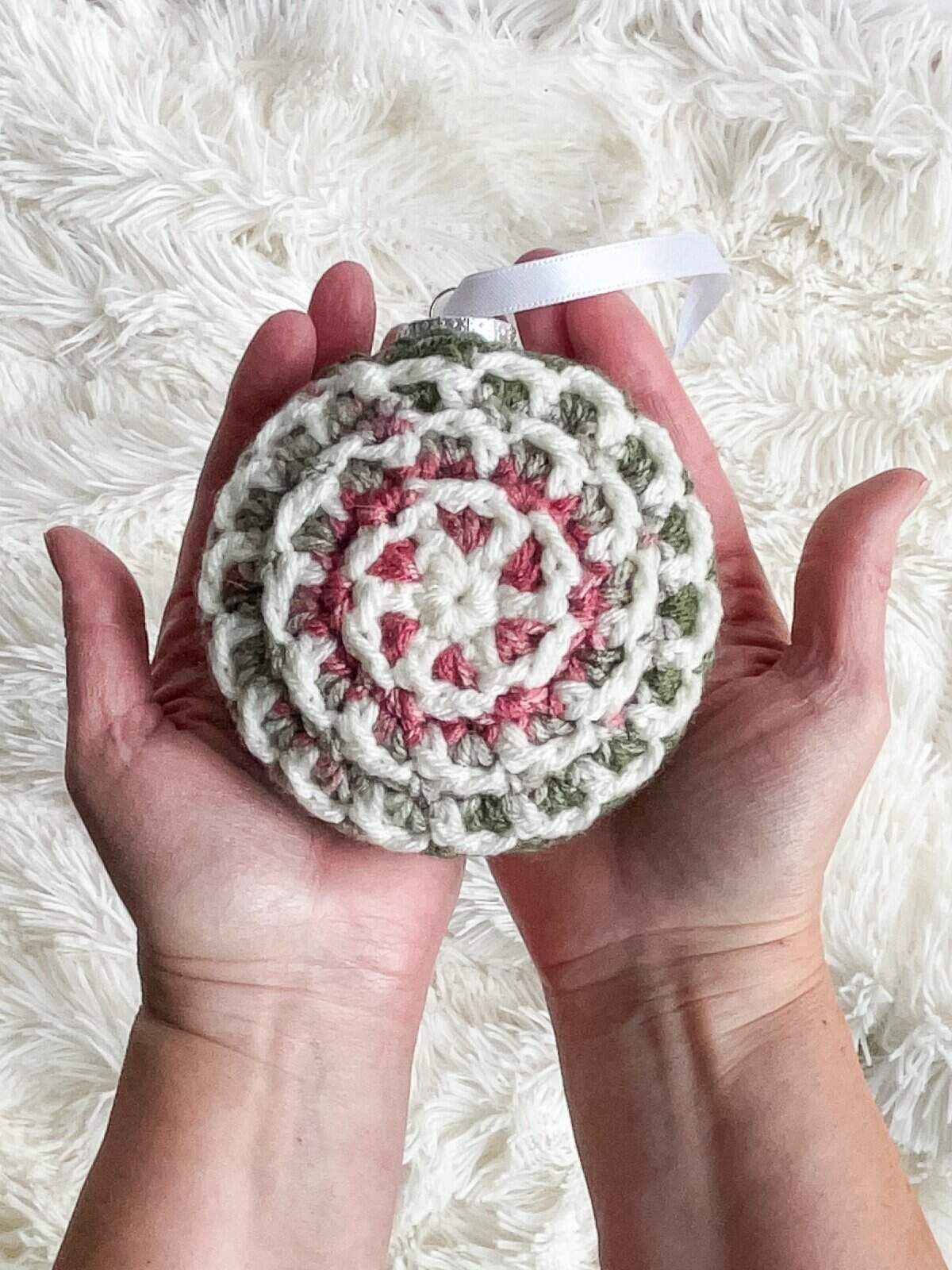 Free crochet pattern using worsted-weight yarn. Pattern attributes and techniques include: Circle, Colorwork, In-the-round, Scrap yarn.