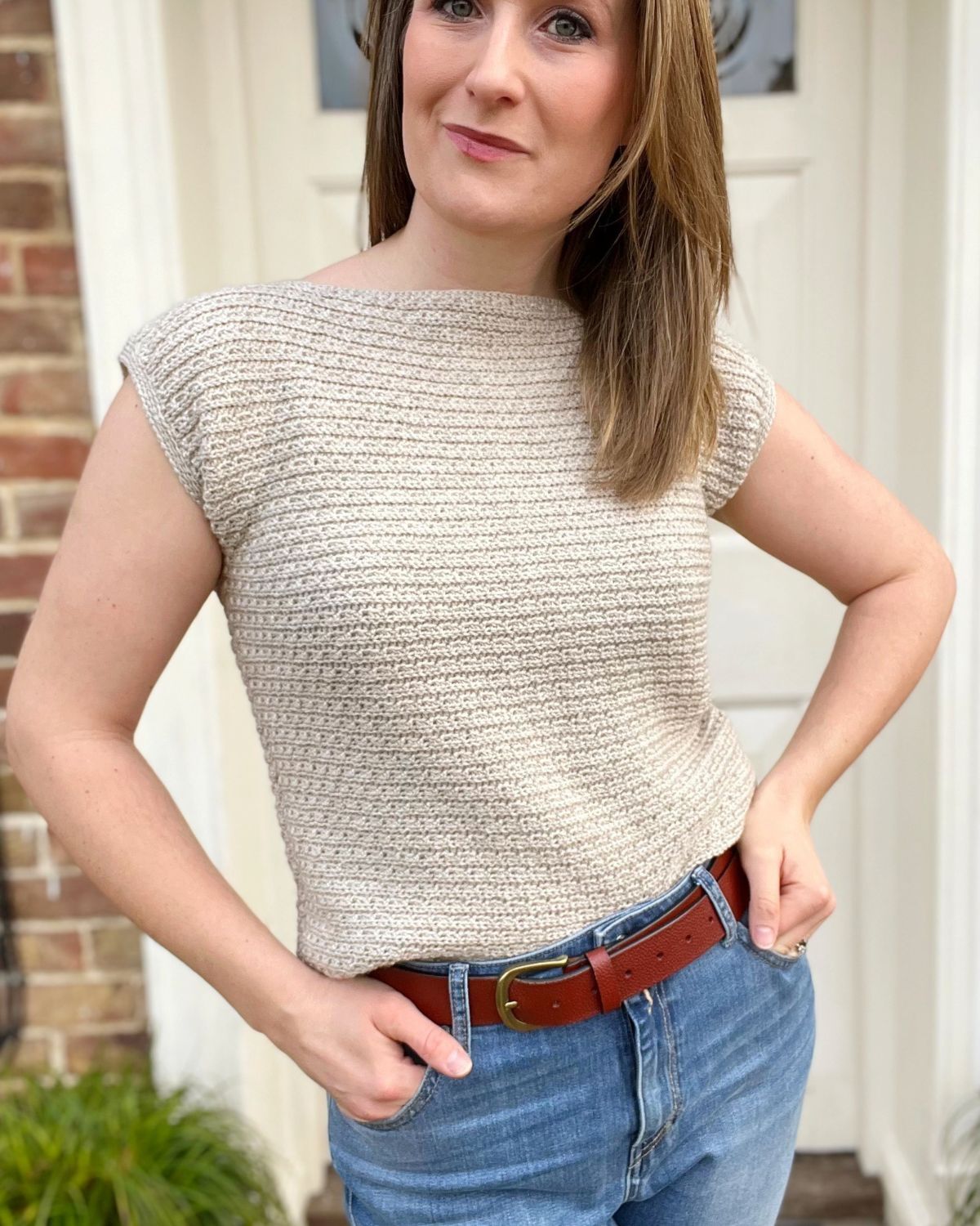 A free crochet pattern using fingering-weight yarn. Pattern attributes and techniques include: Sleeveless, Top-Down, Video tutorials, Worked in sections.