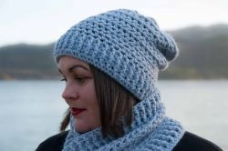 A free crochet pattern using bulky-weight yarn. Pattern attributes and techniques include: Brims, Seamed, Sideways, Slip stitch, Worked as One Piece.
